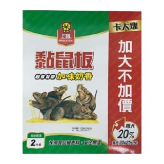品牌:卡大牌 黏鼠板 成分:合成樹脂、橡膠、香料 味道:加味奶香 規格:20*25CM(±0.5CM)x2片 數量:2入 產地:美國 防治對象:老鼠 保存期限:6年 放置範圍:老鼠洞下面、廚房間縫隙、垃圾桶周圍、流理檯下邊緣、傢俱間縫隙、倉庫四周圍 商品特色: * 本產品為了防止中毒事件之發生,採自特殊材料無毒無臭超黏力,使用起來安全衛生。 * 使用之黏鼠板之溫度以20~30度極佳,黏性強,捕獲率極高,任何場所地方均可使用。 * 本產品不必擔心小孩及老人誤食中毒事發生,絕不含任何毒劑,人畜無害請安心使用。 * 使用了黏鼠板後,您不用再為找鼠屍臭生蛆而煩惱,用完後即丟入垃圾桶方便又衛生。 * 本產品特別添加牛奶香味誘引老鼠,大大提高捕獲率。 注意事項: * 本產品如有沾黏到物品或手時,請以抹布沾去漬油及香蕉油擦拭,再用肥皂清洗即可。 * 夜晚時老鼠活動較繁雜,睡覺前將黏鼠板放置適當位置,早起時收拾好,以免無意中走動踏到。 * 為了須防老鼠掙扎或拖逃,可事先用舊報紙或雙面膠使之固定,以防老鼠拖板逃走。 * 勿將黏鼠板放置於風沙灰塵繁多之處,且勿放在空氣潮濕之場所,以防止黏膠黏性減低。