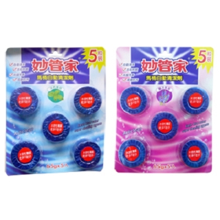品牌:妙管家固體潔廁劑 天然薄荷/薰衣草香 材質:介面活性劑、抑菌劑、香料、色料、美國小蘇打、高級進口精油 規格:65g 數量:5入 產地:台灣 特色: * 採用最新環保配方技術 * 具清潔、抗菌、消臭、芳香等功效 * 為特殊清潔配方:能自動清除水箱及馬桶之汙垢 * 為特殊抗菌配方:能有效抗菌及防止水箱及馬桶內的微生物滋長,並去除其分泌物所產生的臭味,確保水箱、馬桶乾淨衛生。 * 為特殊消臭配方:使用本品可使您每天「坐」得輕鬆、「坐」得舒適 * 全新水溶膜包裝,不沾手更便利 * 本品為固體濃縮配方,免安裝、效果較長。 使用方法: 1.撕下塑膠殼,把水箱內之水沖掉,將本品直接投入馬桶水箱浮球下方即可(外層塑膠殼膜為水溶性材質,請勿撕除) 2.當顏色逐漸變淡時,可視實際需要投入新的「馬桶清潔錠」以維持效果。 注意事項: * 商品顏色因網頁呈現及拍攝環境產生色差,依供貨樣式為準 * 人工測量的尺寸會有些許誤差,但不影響商品品質,請見諒 * 放置於小孩及寵物不易觸及處 * 請放置陰涼處,避免陽光曝曬 * 若不慎接觸及眼睛或皮膚,先用大量清水沖洗,仍有不適現象請盡速就醫。