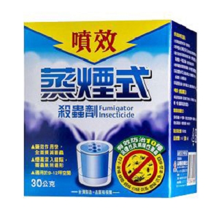 品牌:噴效蒸煙式殺蟲劑 成分:賽酚寧、協力精 劑型及內容量:30g 數量:1入 製造商:台灣 特色: * 藥效作用快,全面撲滅害蟲 * 煙霧可有效深入縫隙,害蟲無所遁形 * 操作簡單方便使用 * 蒸煙式(水煙式)殺蟲劑: * 30g大容量,適用於9-12坪空間 * 有效防治滋擾性及病媒性害蟲 許可證字號:環署衛製字第 2022號 環藥販售字第63-042號 使用方式: 1. 請先關閉門窗,並將廚櫃、抽屜等全打開,效果更佳。 2. 取出鐵罐置於室內中心位置,押下按鍵使其卡住定位,藥劑將全數物化噴出。 3. 緊門窗2小時以上再打開門窗及通風孔使空氣流通。 4. 有效空間10-15平方公尺,較大空間請增加使用罐數。 注意事項: * 請保存於陰涼處。 * 商品顏色因網頁呈現及拍攝環境產生色差,依供貨樣式為準 * 人工測量的尺寸會有些許誤差,但不影響商品品質,請見諒 * 請置於兒童、寵物無法取得處,以免誤食。 * 包裝拆封後,請儘速使用完畢,以防變質。 * 請勿直接向火焰及人、動物身上噴灑, 噴灑時請避免汙染食物、飼料、食器等。 * 一般環境用藥:本劑對水生生物具毒性,請勿污染或使用於魚池、水源、池塘、湖泊、河流等水域。